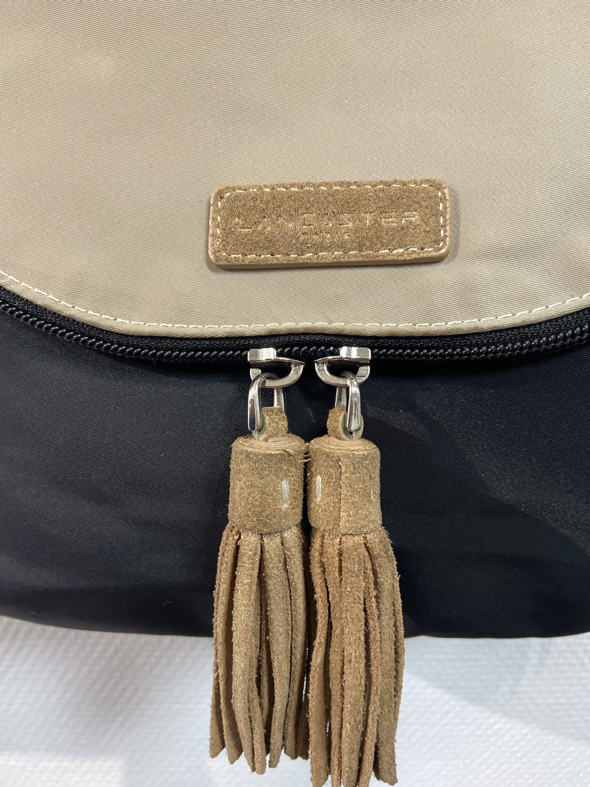 Joli sac en cuir et tissu noir et beige avec pompons en daim devant