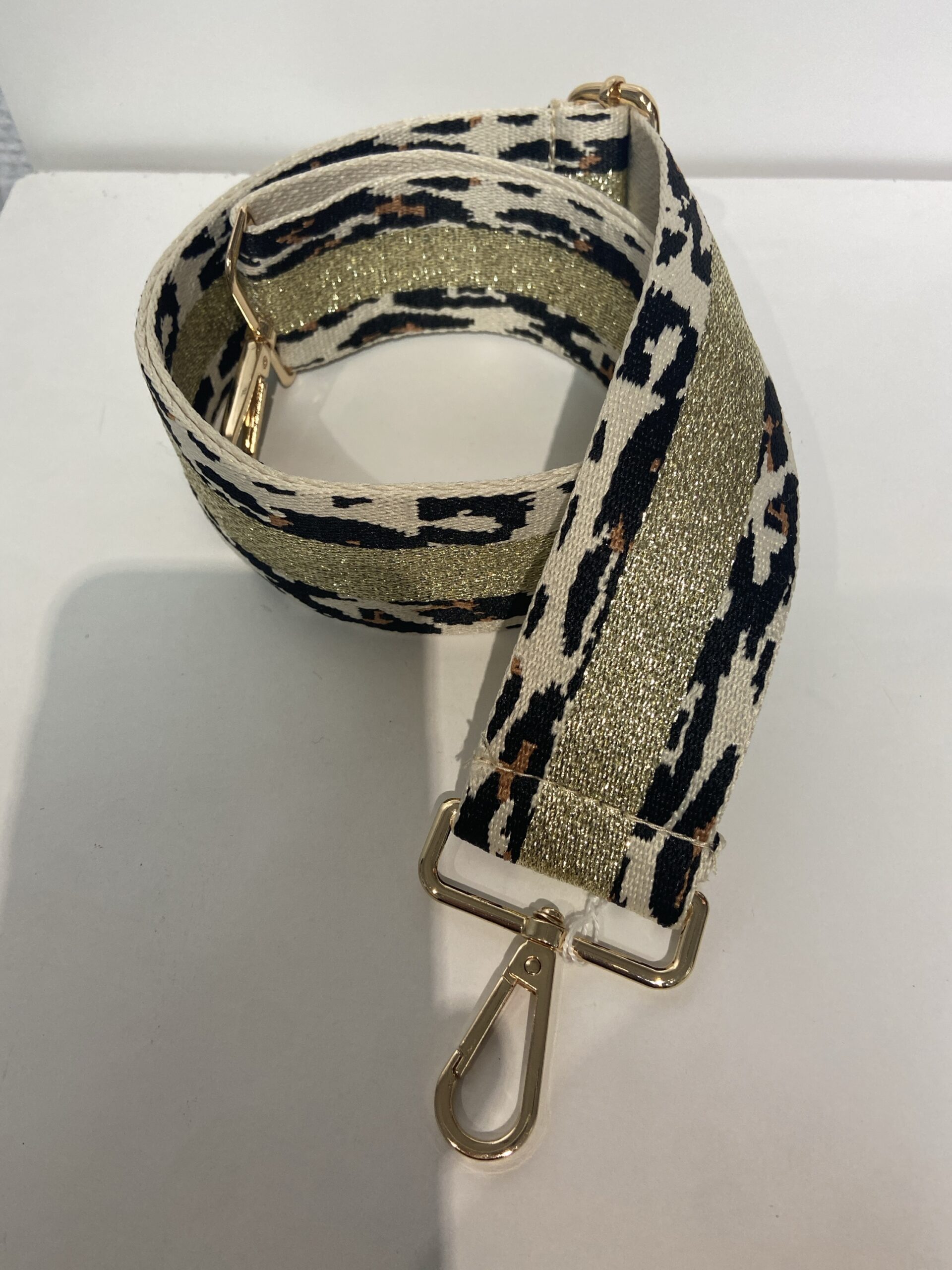 Sangle de sac en tissu épais couleur or, marron et beige. Boucle métal doré